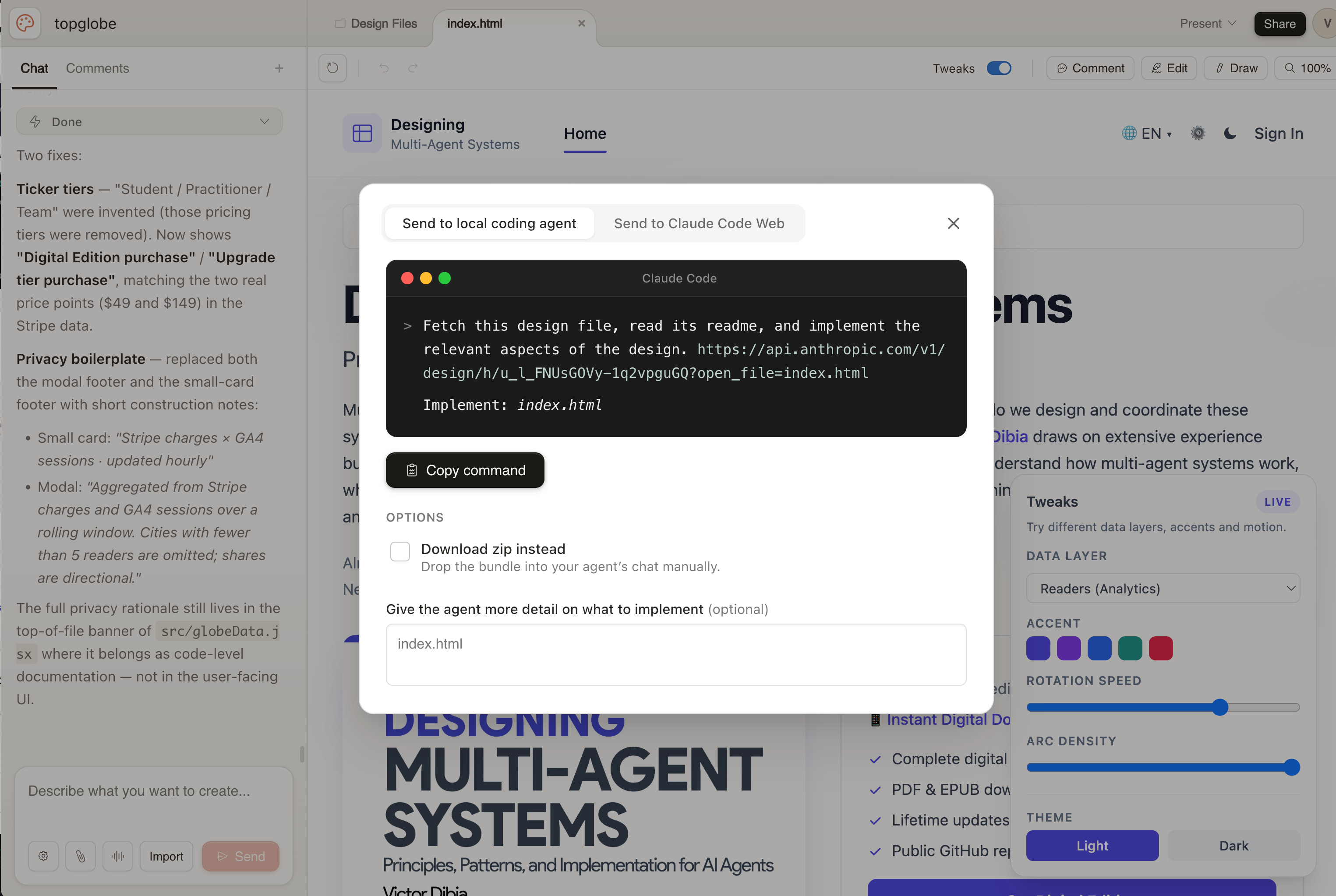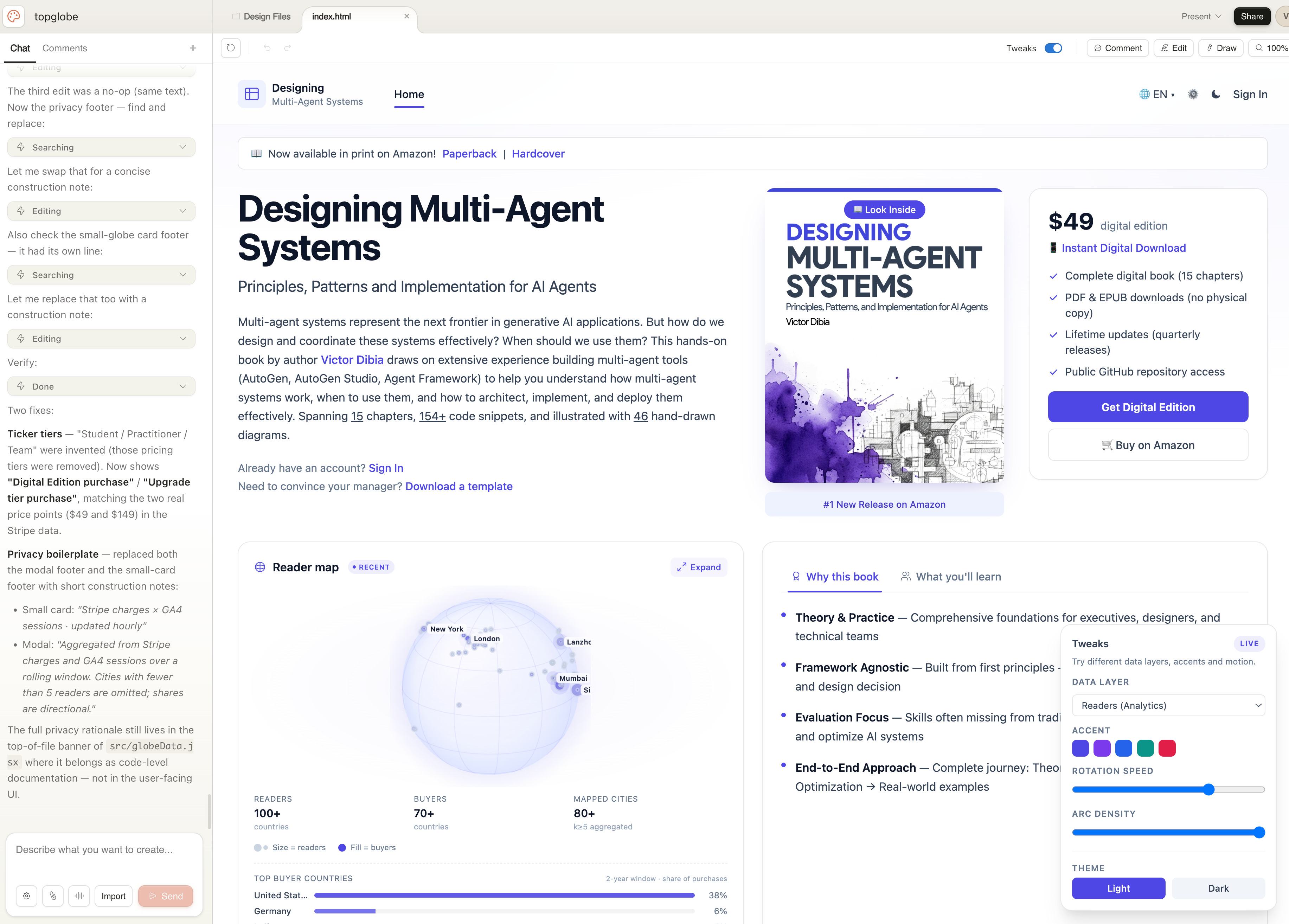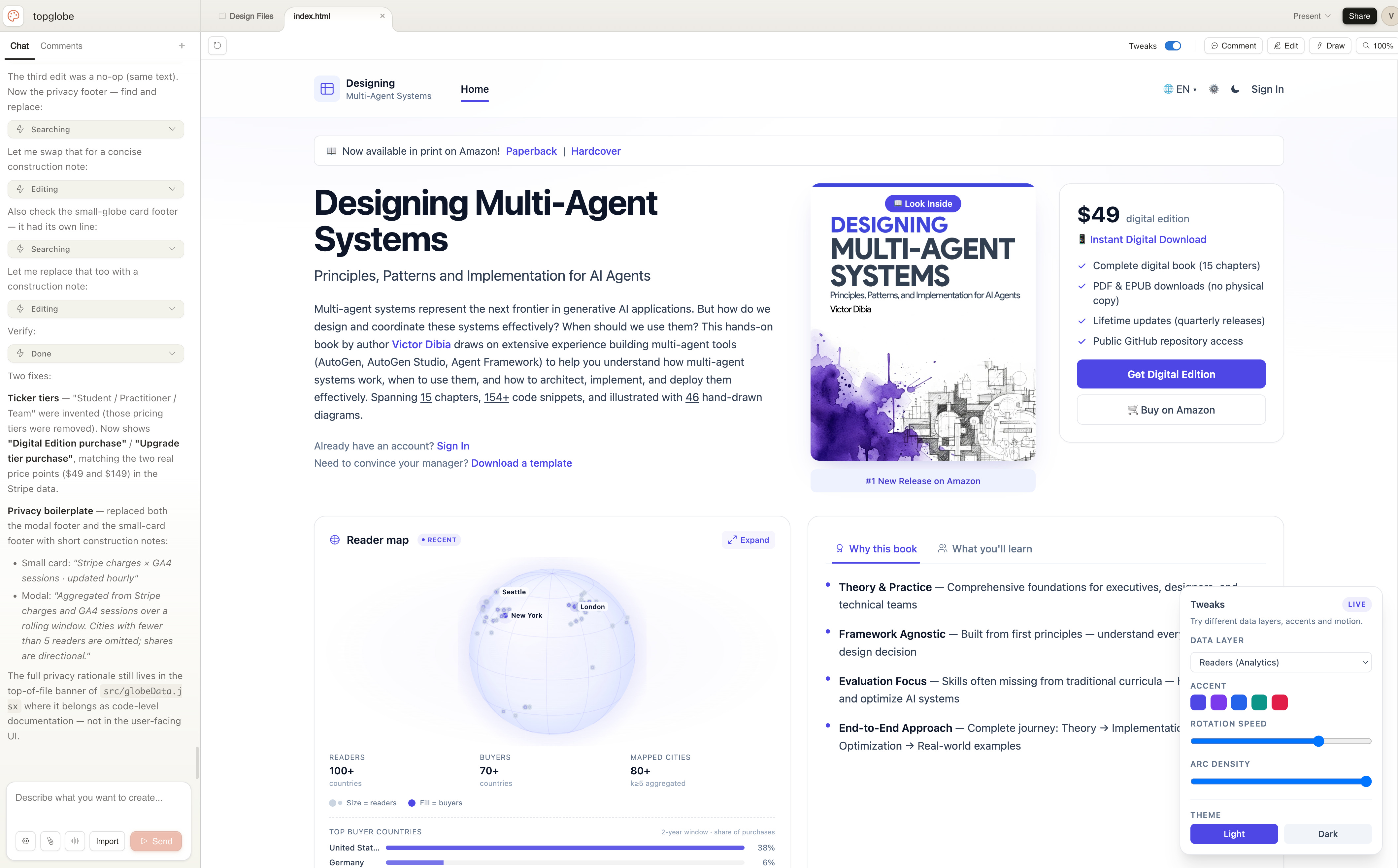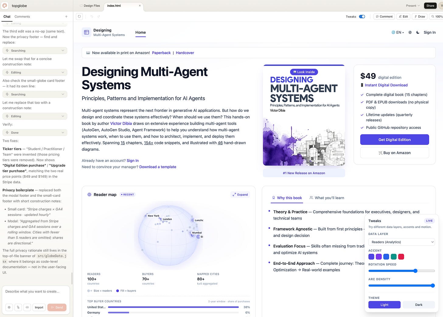 I tried it on a real task: add an interactive globe to buy.multiagentbook.com (see video below) showing where readers of Designing Multi-Agent Systems come from, wired to real Google Analytics and Stripe data. Below is what worked, where human judgment was still needed, and the engineering outcome.