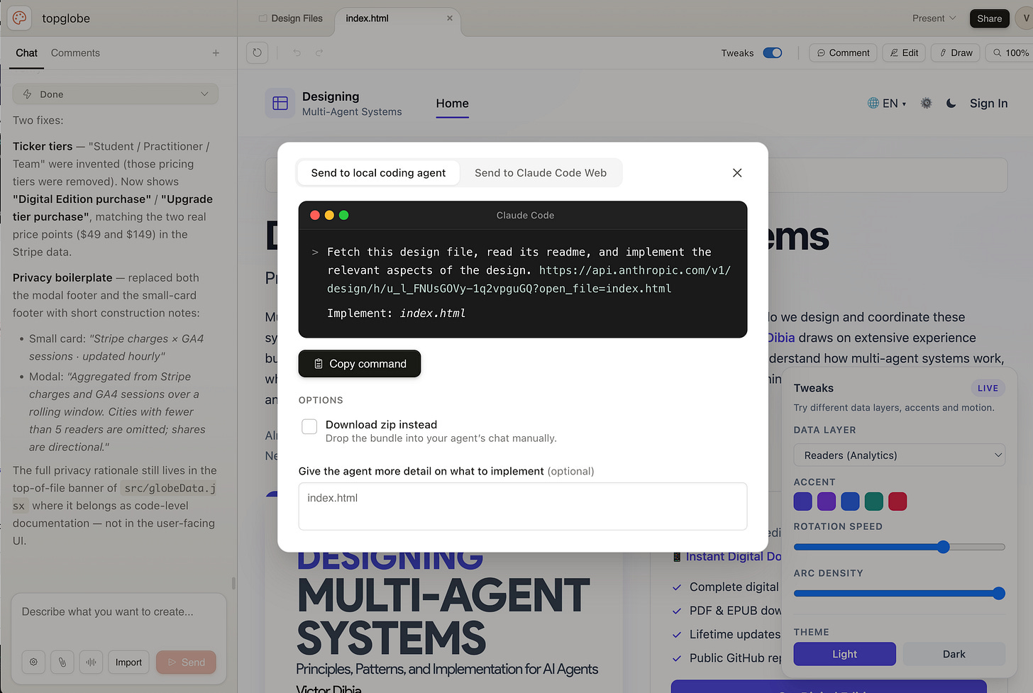 Claude Code handoff. It packages finished designs into a bundle structured for a coding agent to pick up.