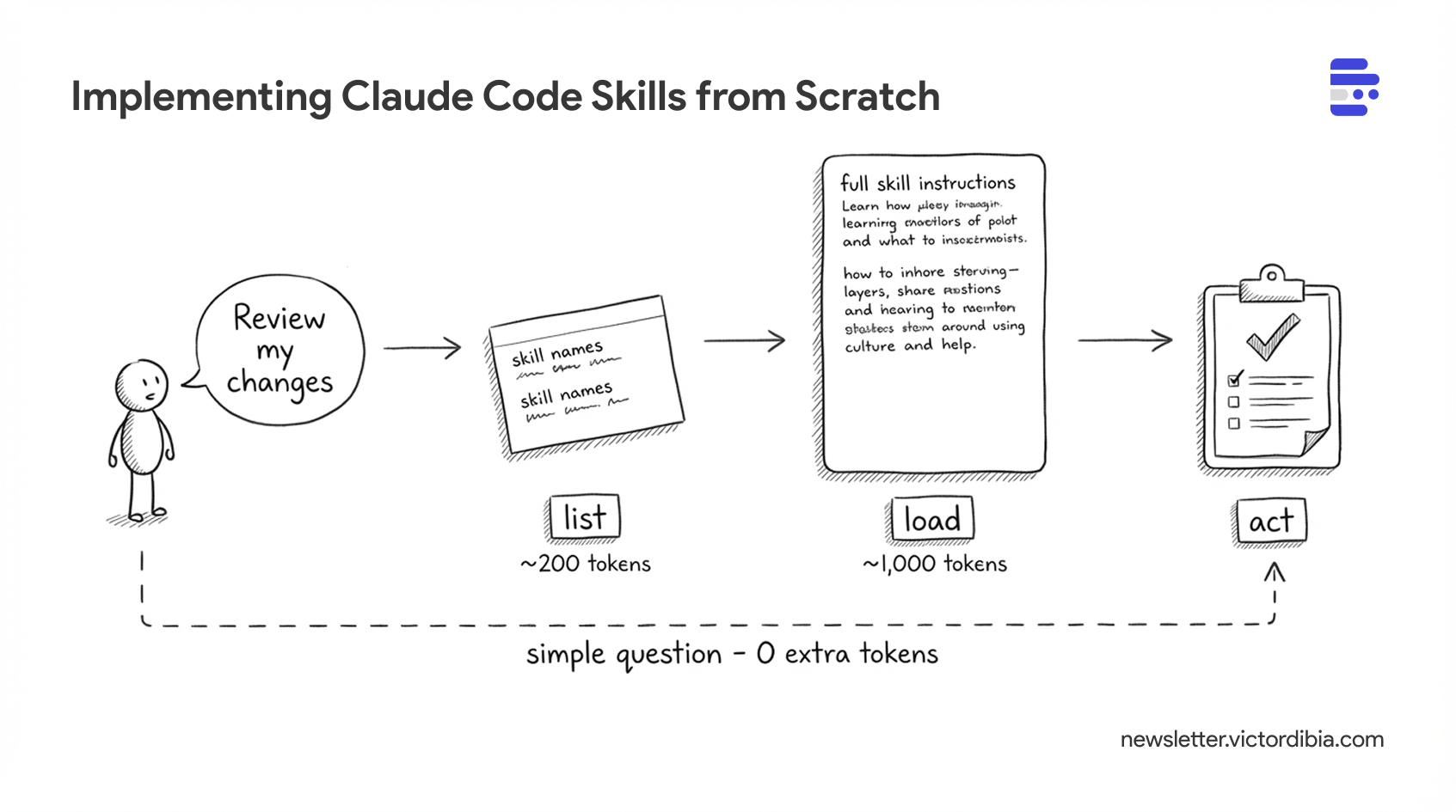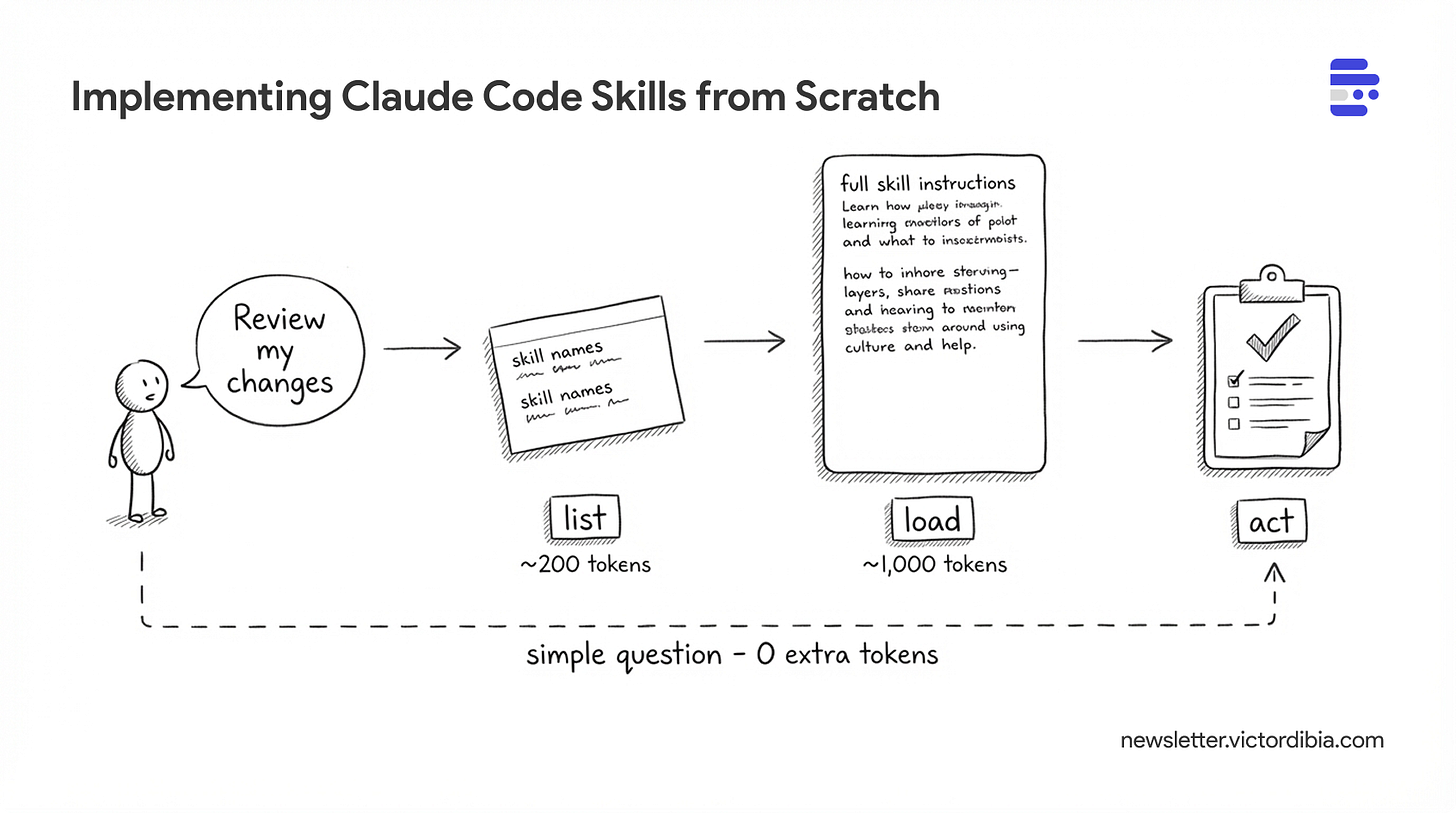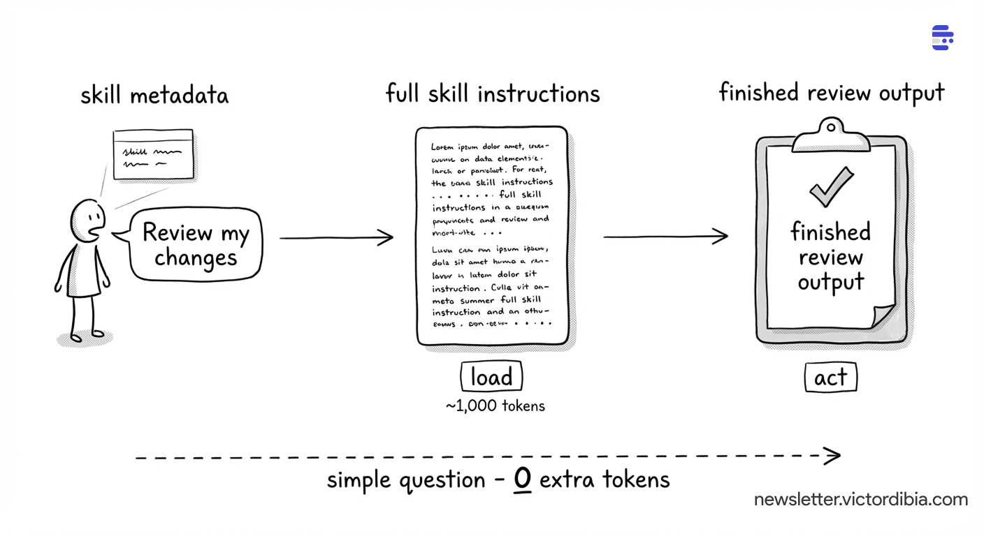 The load in step 3 only happens when needed. If the user had asked a simple question, no skill would load and those ~1,000 tokens are never spent.