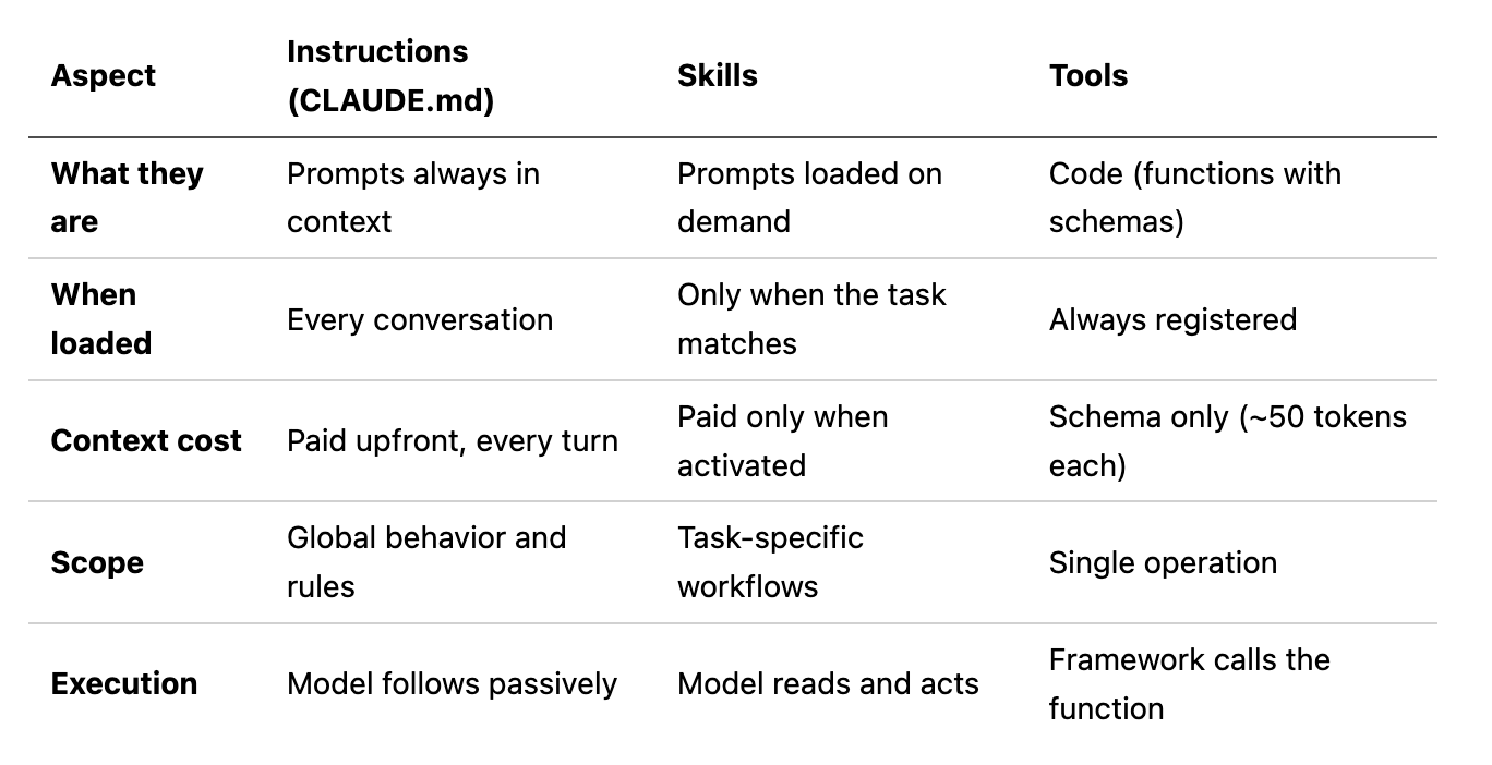 get_weather(city).Skill: “when the user asks for a code review, follow this checklist and use these tools.”