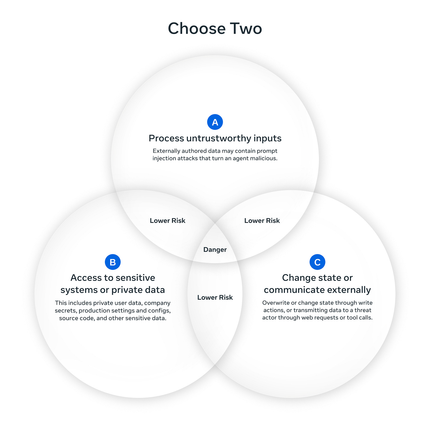 Trying to replicate that magic as part of a service is a fundamentally different proposition. If you sandbox the agent, you cut off the access that makes it useful. Meta’s Agents Rule of Two - inspired by Chromium’s security policies - offers a useful framework: until robust defenses against prompt injection exist, agents should satisfy no more than two of these three properties:
